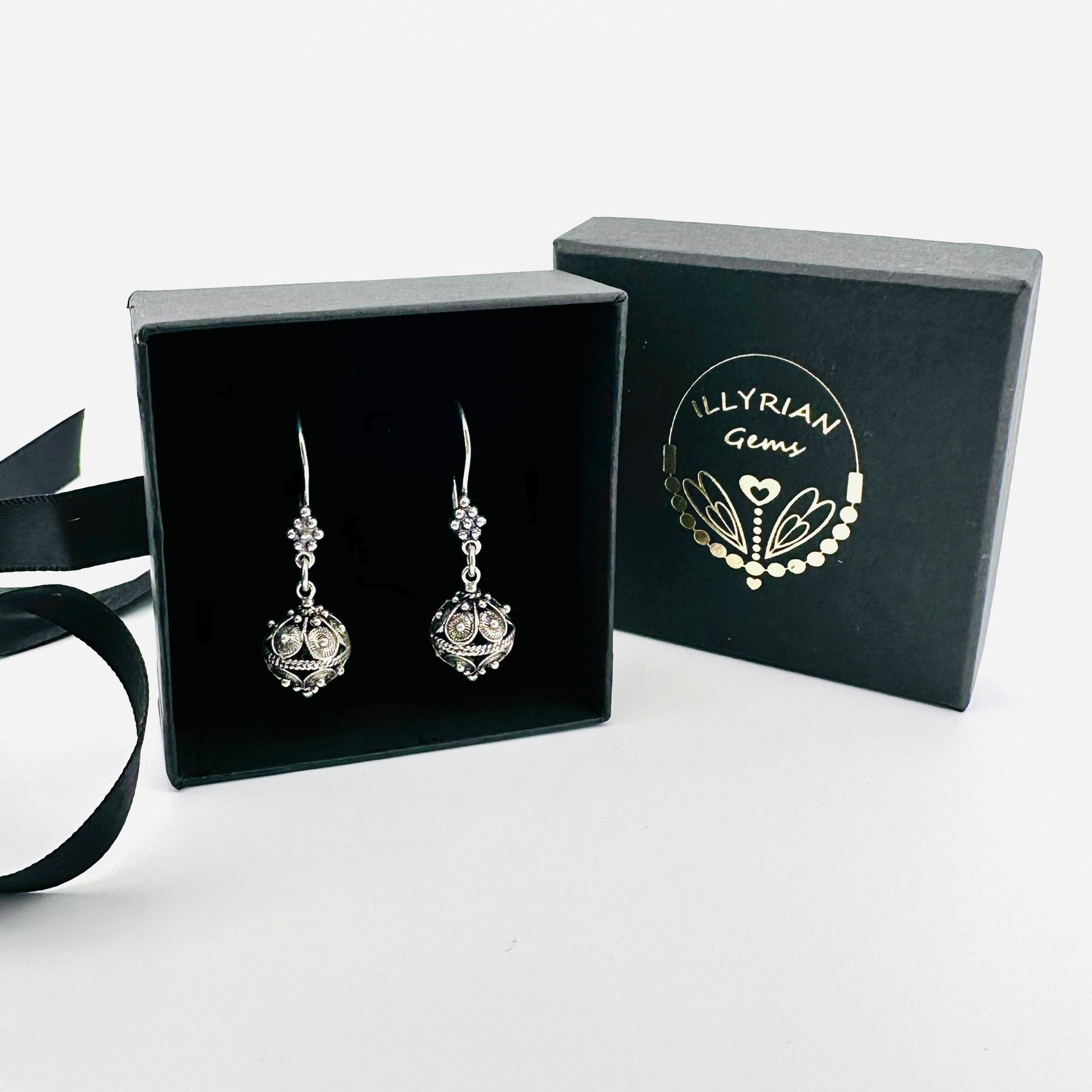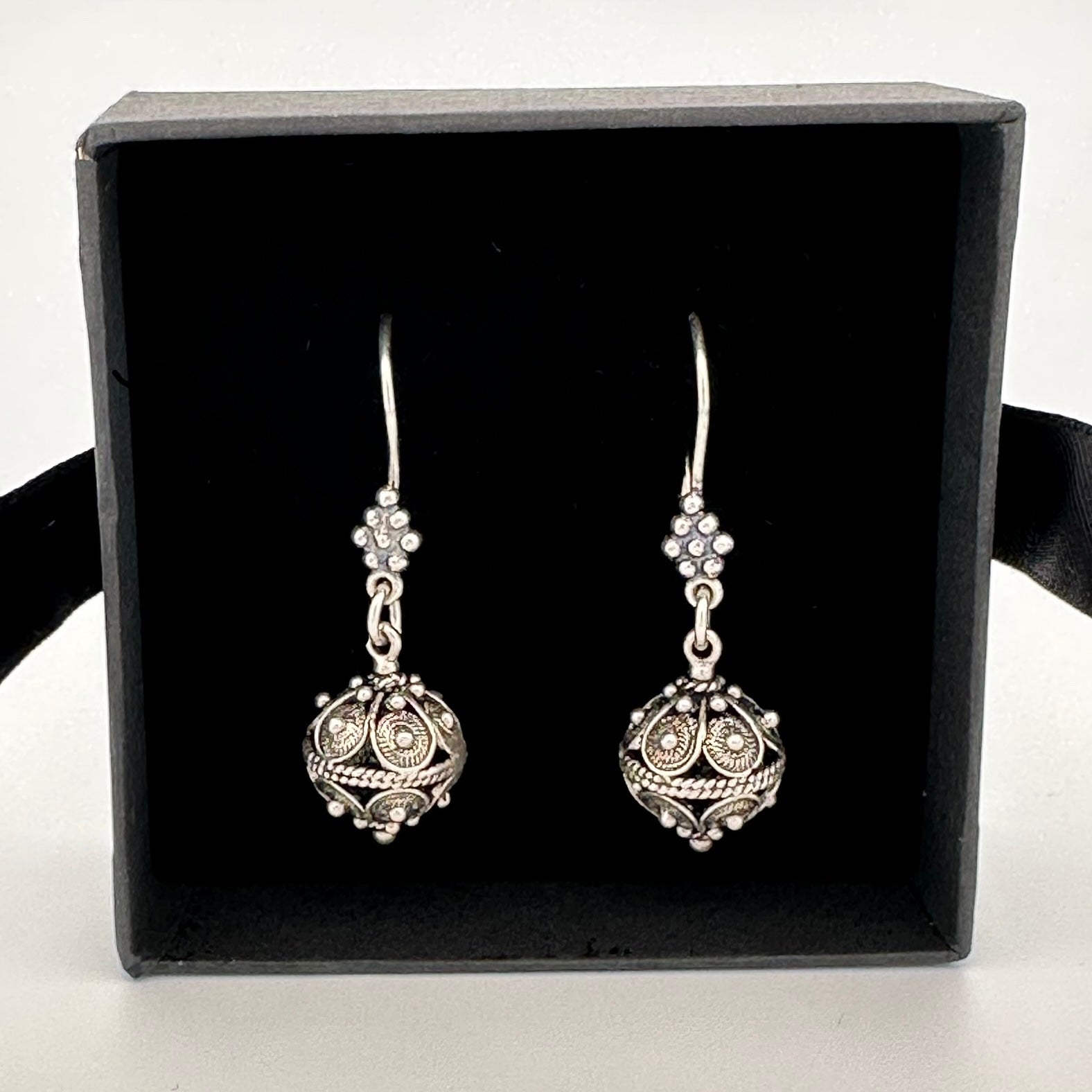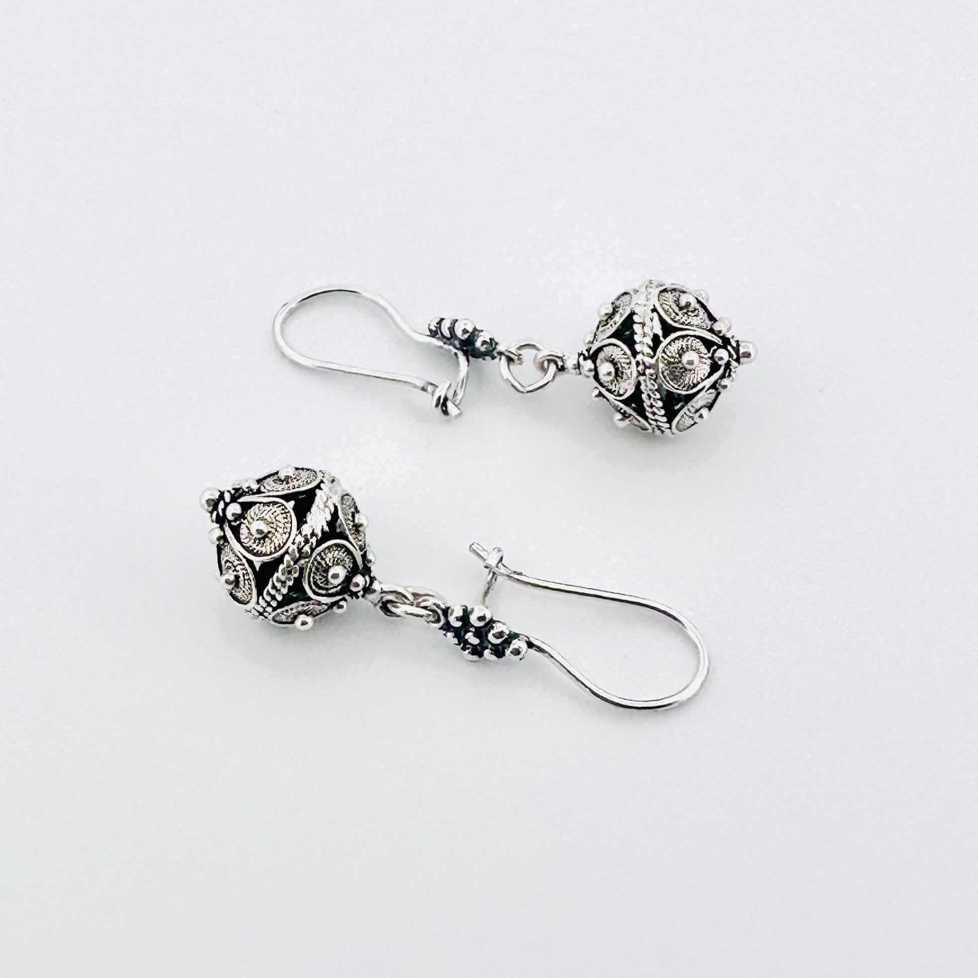 Earrings are made from rhodium plated sterling silver in a detail oriented filigree technique.