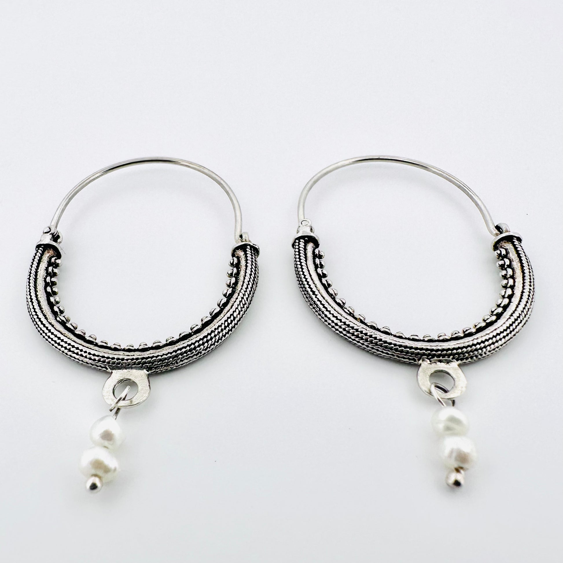 These simple and elegant hoop earrings are made from rhodium plated sterling silver and freshwater pearls.