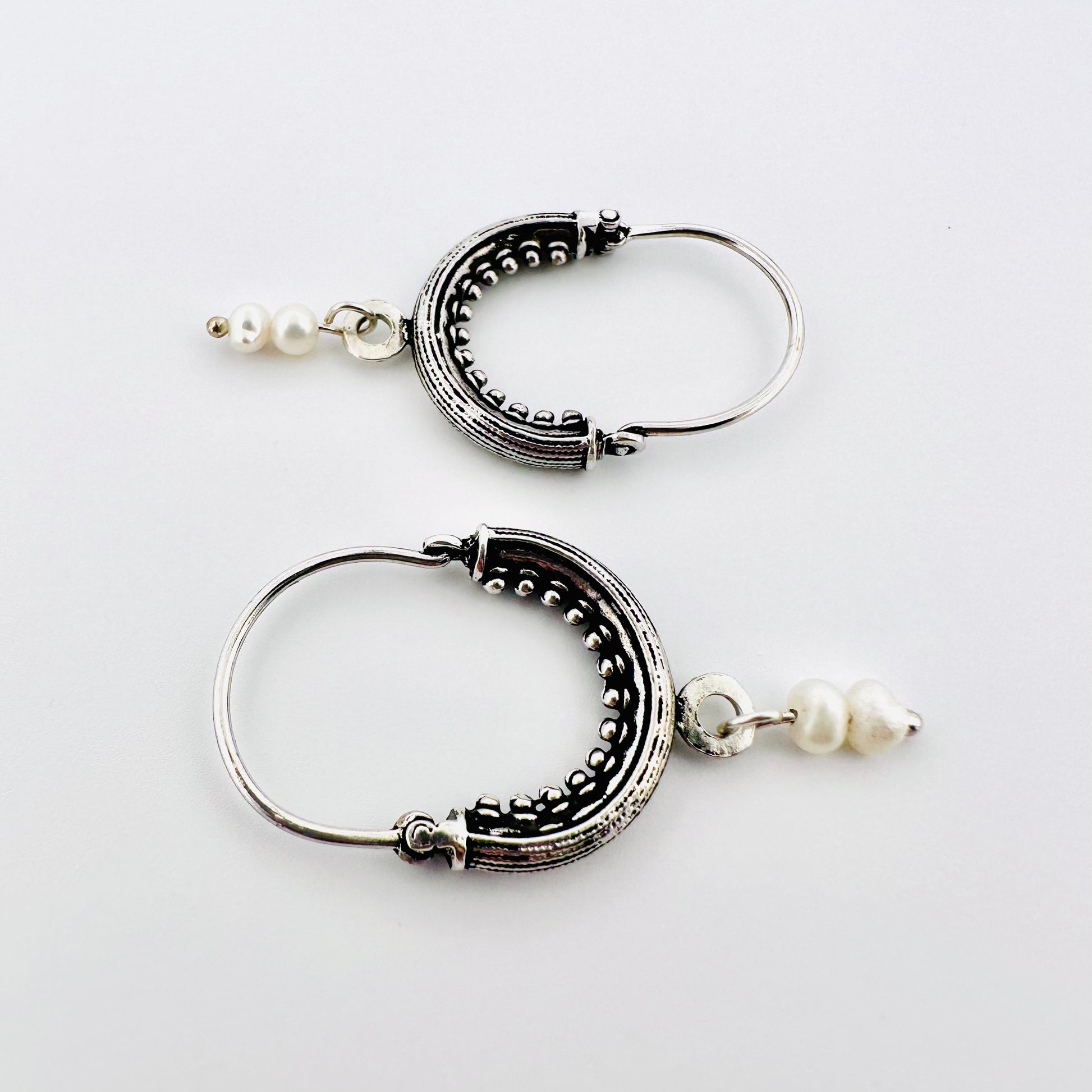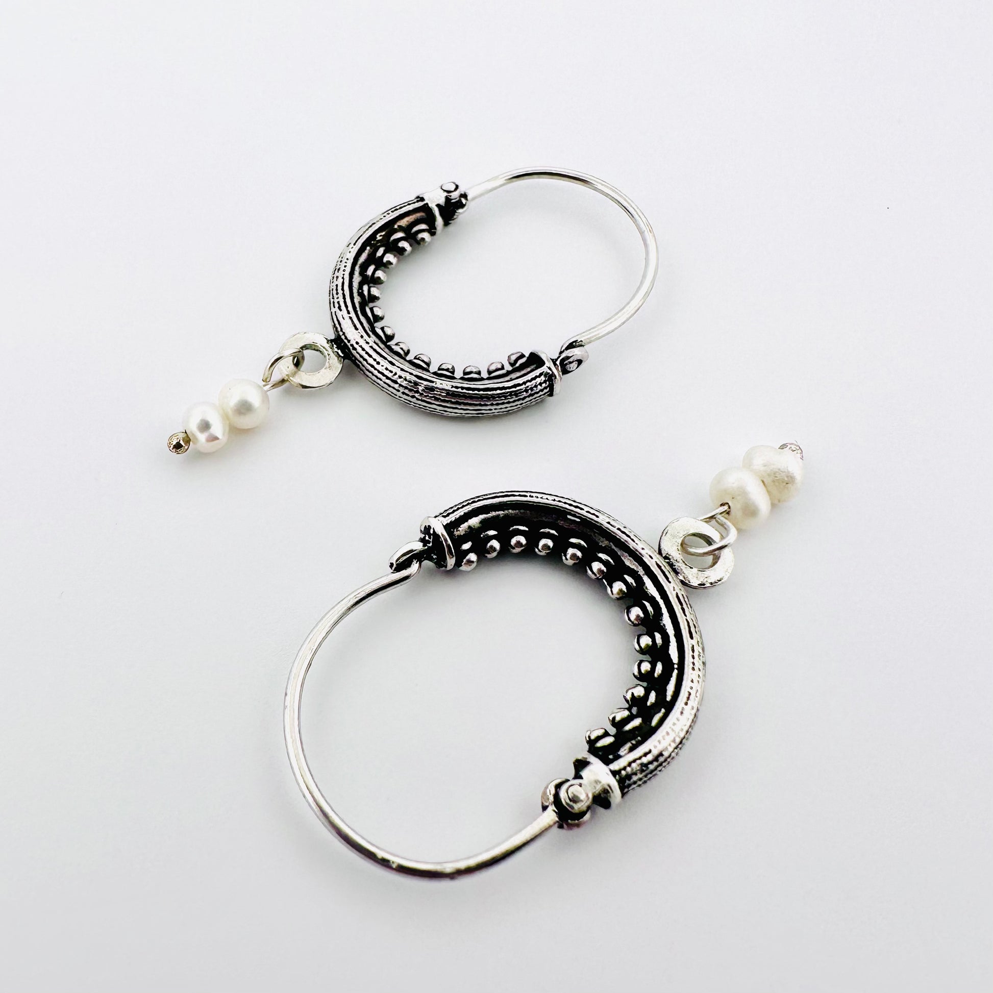 These simple and elegant hoop earrings are made from rhodium plated sterling silver and freshwater pearls.